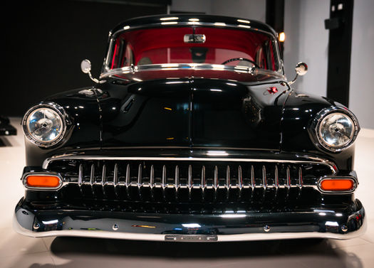 This is definitely not your everyday Bel Air. This automobile has been upgraded and redone in every aspect. The paint is a beautiful glossy black and grilles have been polished up to see your reflection in them. and the white band tires just makes it all complete with a nostalgic look.